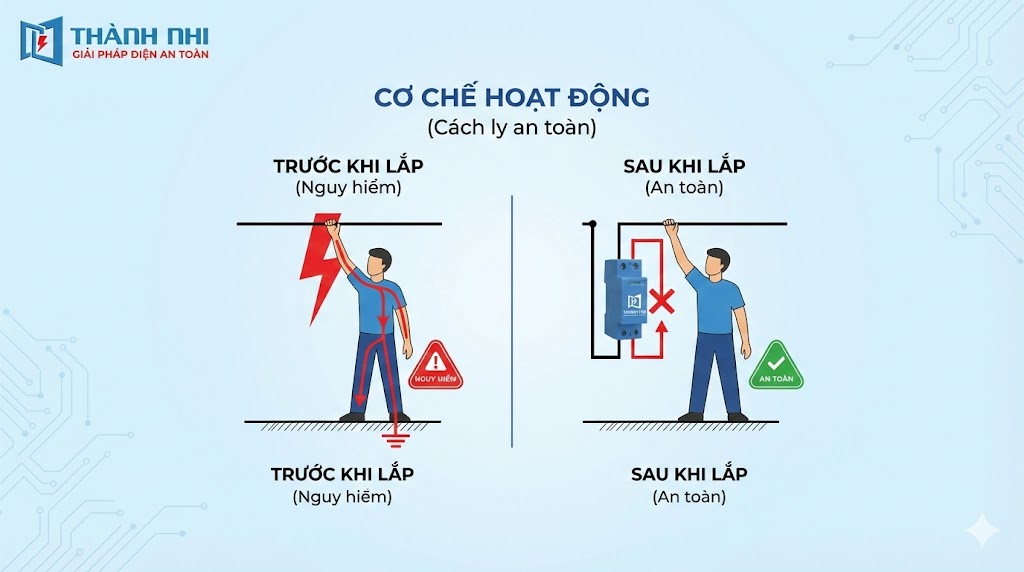 Nguyên lý cốt lõi của thiết bị bảo vệ chống điện giật cách ly nằm ở khả năng kiểm soát dòng điện chạy qua cơ thể người xuống đất.