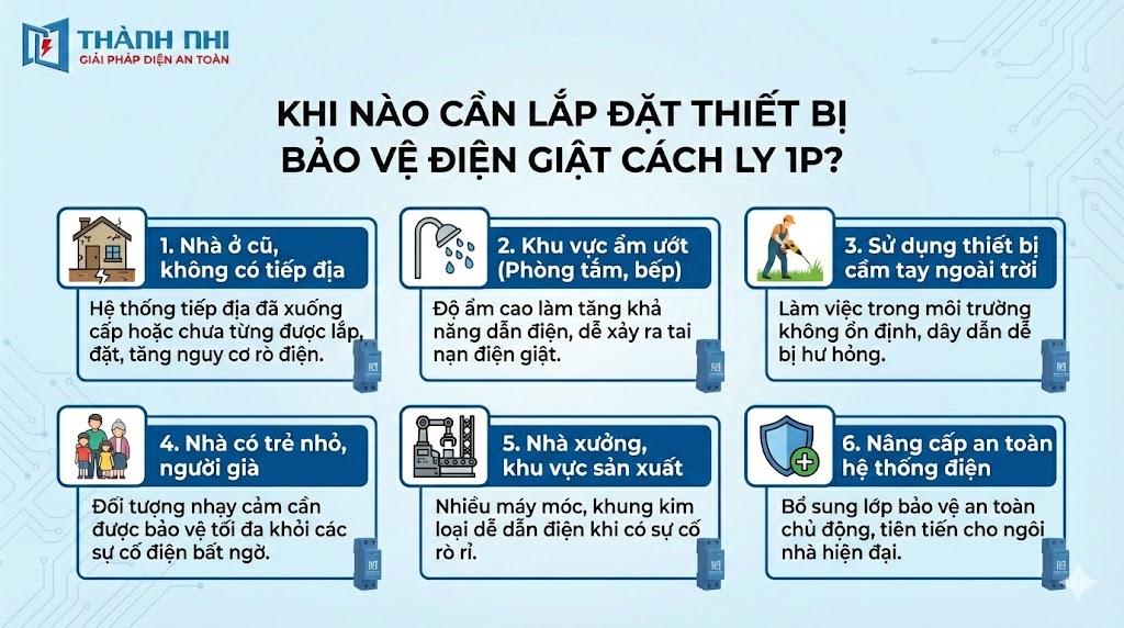Dù hệ thống điện nhà bạn mới hay cũ, thiết bị bảo vệ điện giật cách ly 1P là sự đầu tư không bao giờ thừa, đặc biệt trong các trường hợp sau: